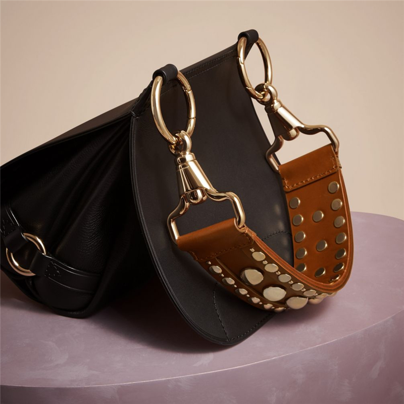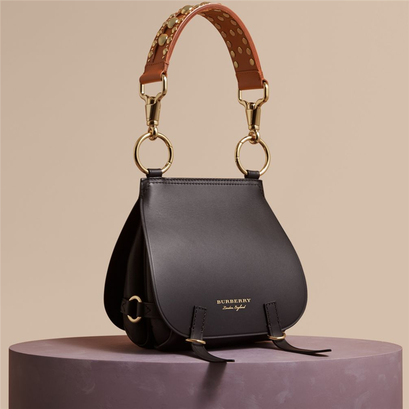 - 顏色:40456481 巴寶莉 The Bridle 光滑皮拼粒紋皮 鉚釘鑲綴肩帶 馬勒包 黑色