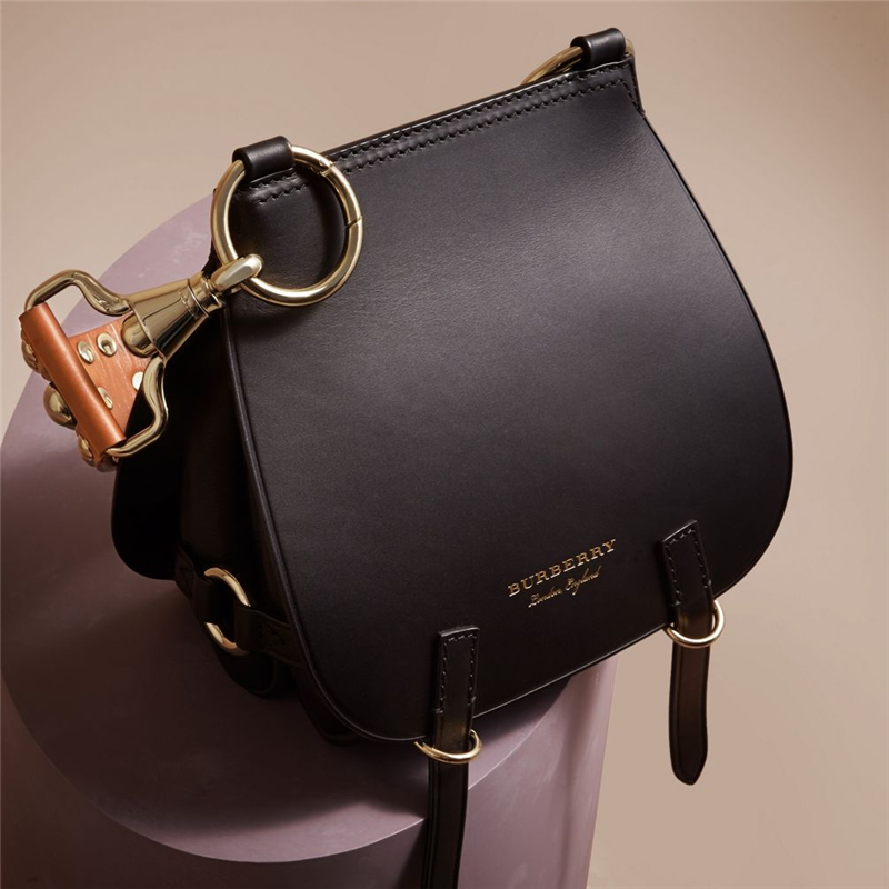 - 規(guī)格:40456481 巴寶莉 The Bridle 光滑皮拼粒紋皮 鉚釘鑲綴肩帶 馬勒包 黑色