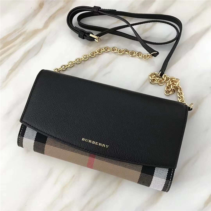 40482501 巴寶莉 House 格紋拼皮革 錢夾鏈條包 黑色
