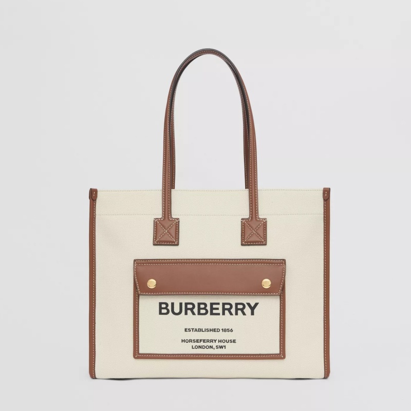 80441381 巴寶莉Burberry小號雙色帆布拼皮革 Freya 托特包 巴寶莉女包 棕色