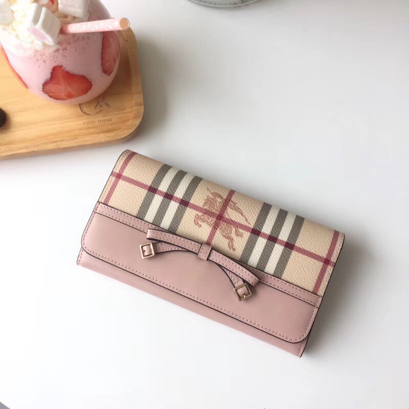 Burberry巴寶莉 格紋按扣 蝴蝶結 戰馬印花 女士長款錢包 裸粉