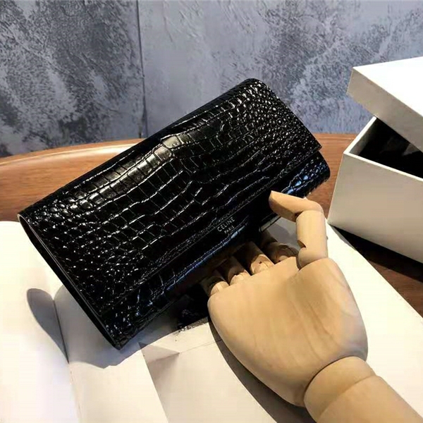 Celine錢包 鱷魚紋 小牛皮 大號(hào) Celine翻蓋長(zhǎng)款錢包 黑色