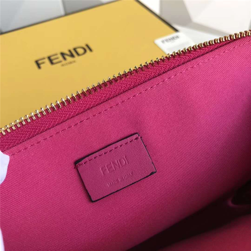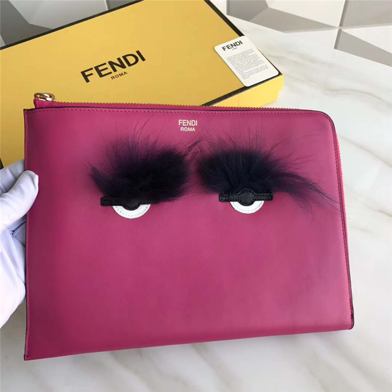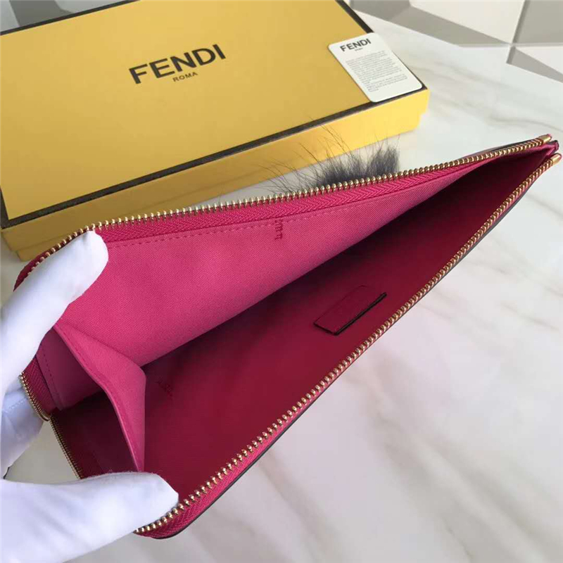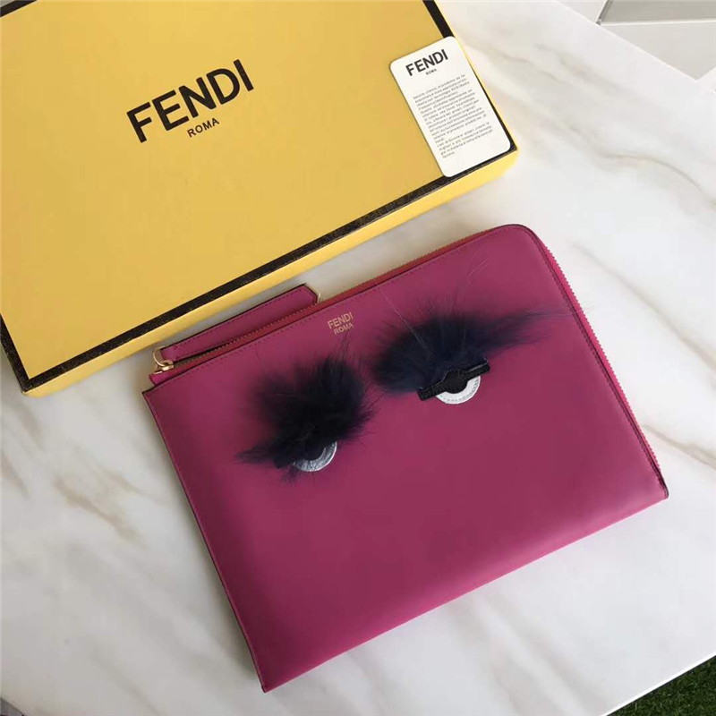 - 0363 FENDI 芬迪 柔軟小牛皮 毛絨眼睛 拉鏈?zhǔn)帜冒?玫紅色
