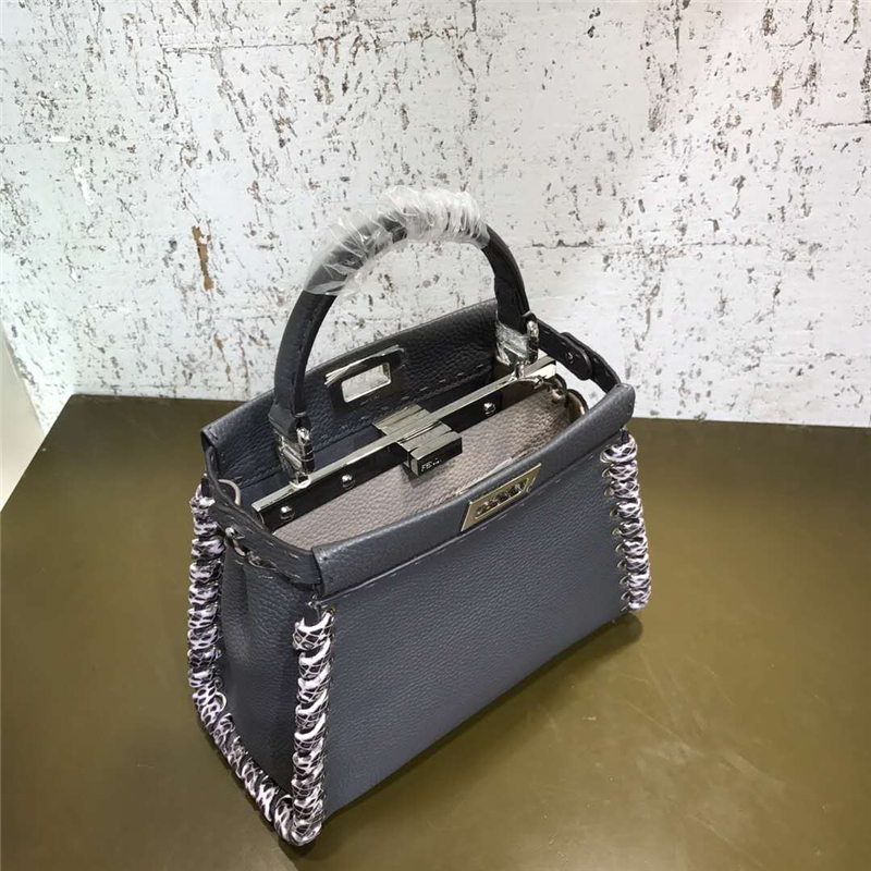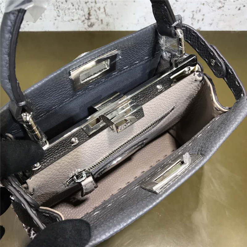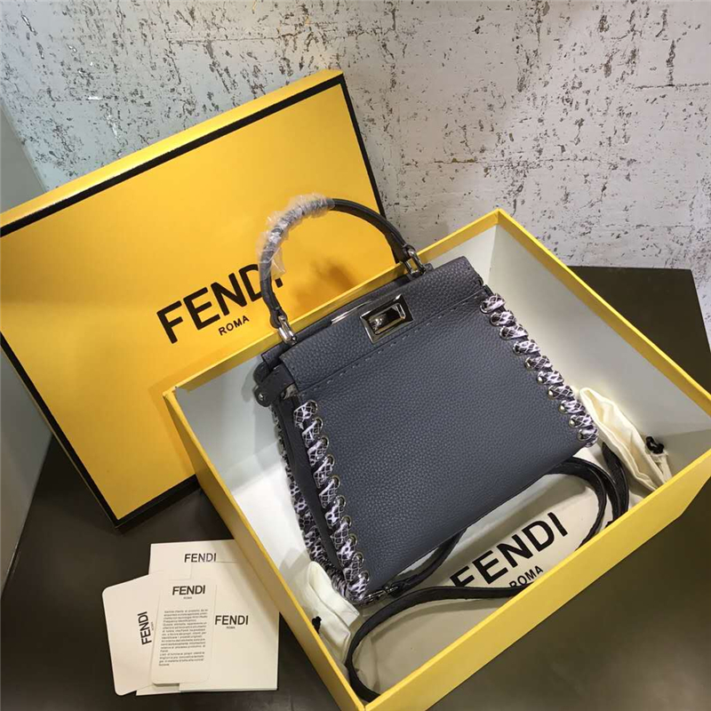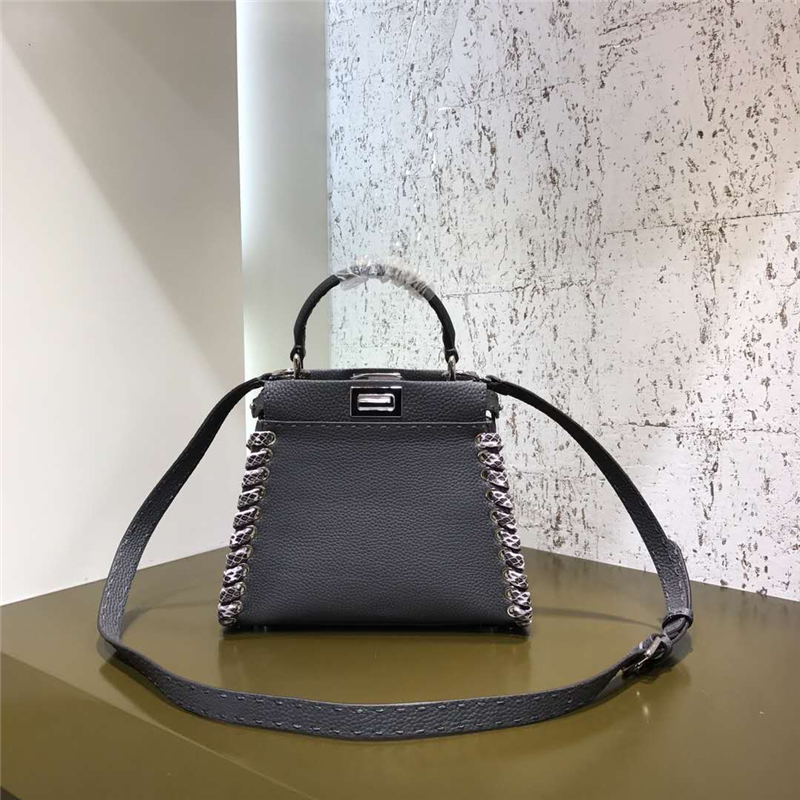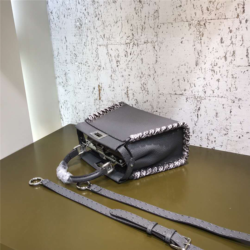 3105S FENDI芬迪 MINI 邊緣蛇皮編織裝飾 荔枝紋牛皮手提包 深灰色