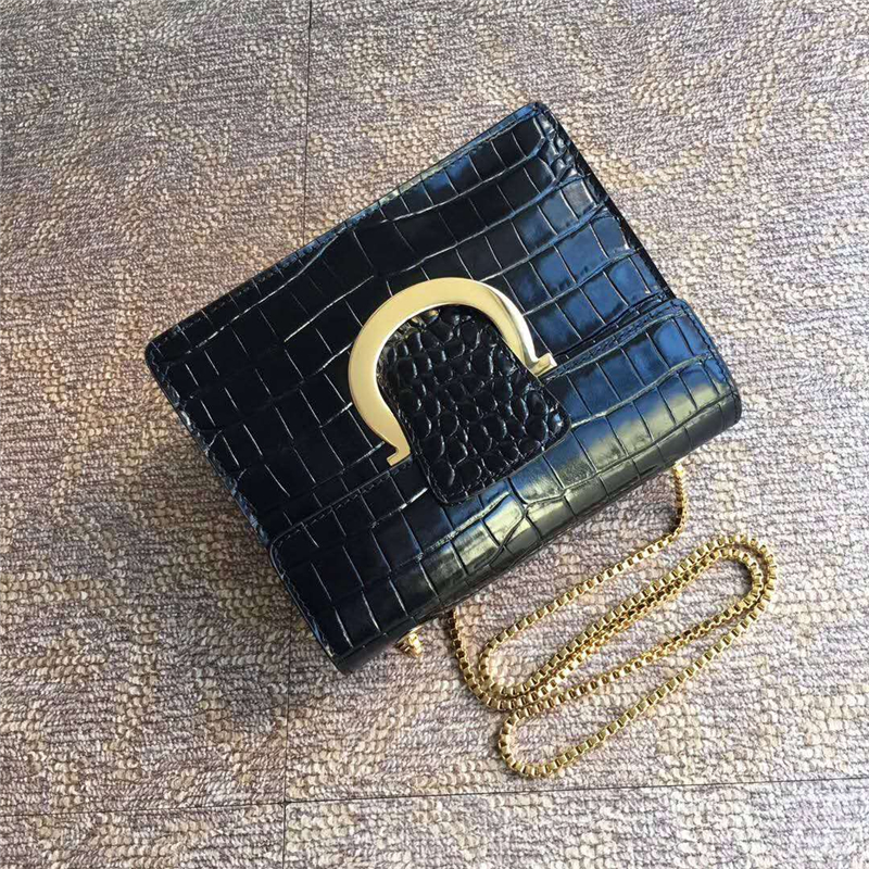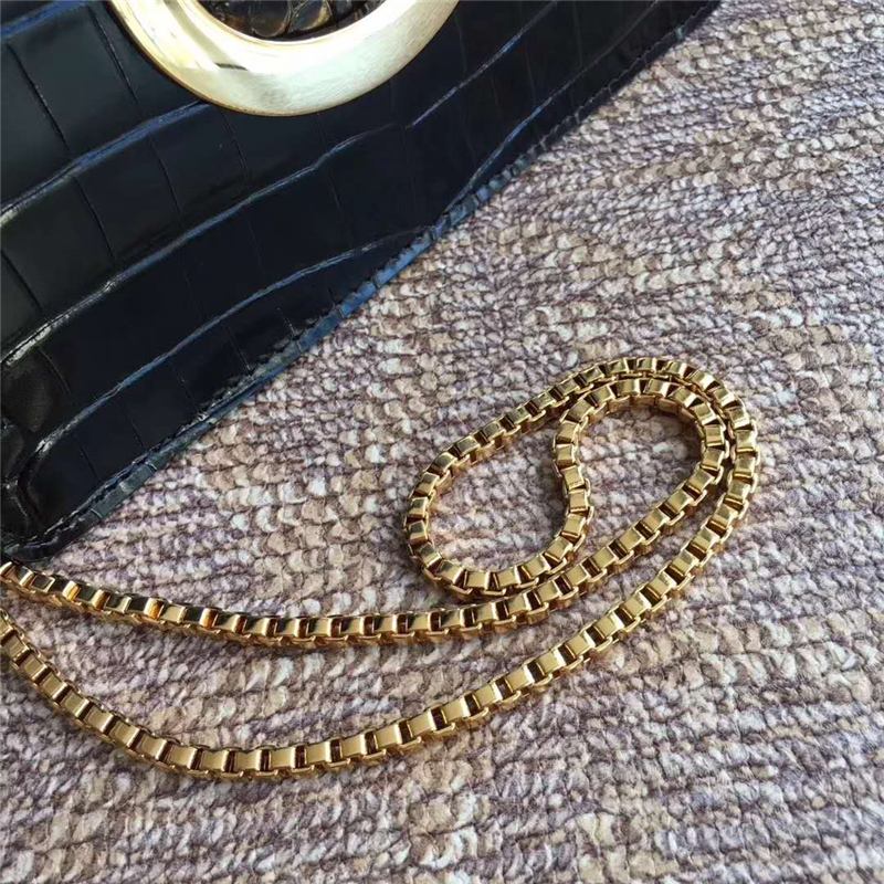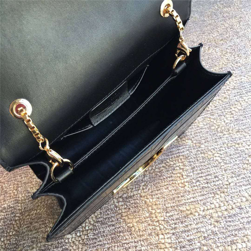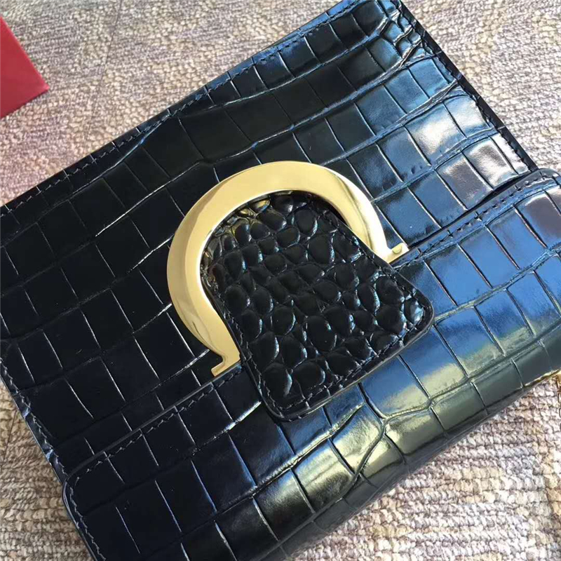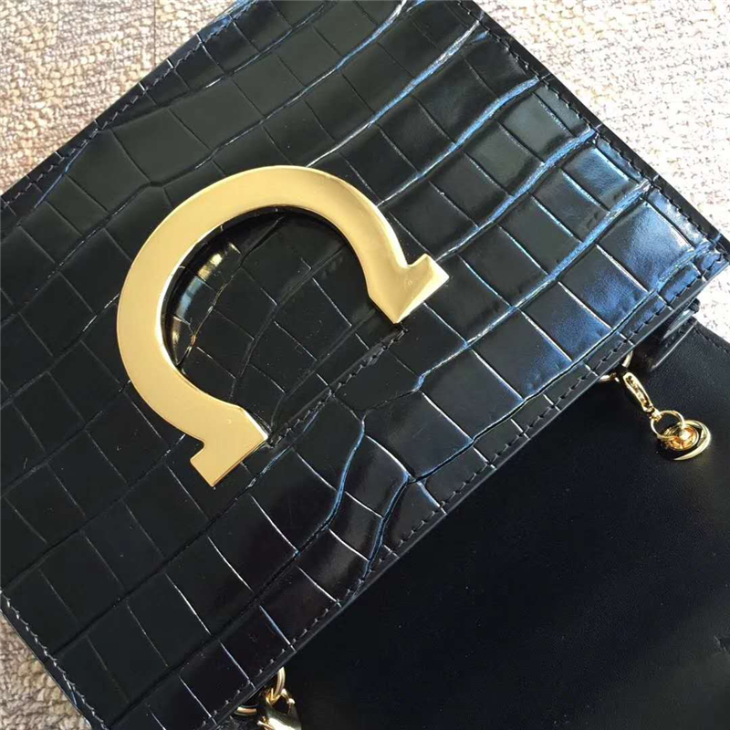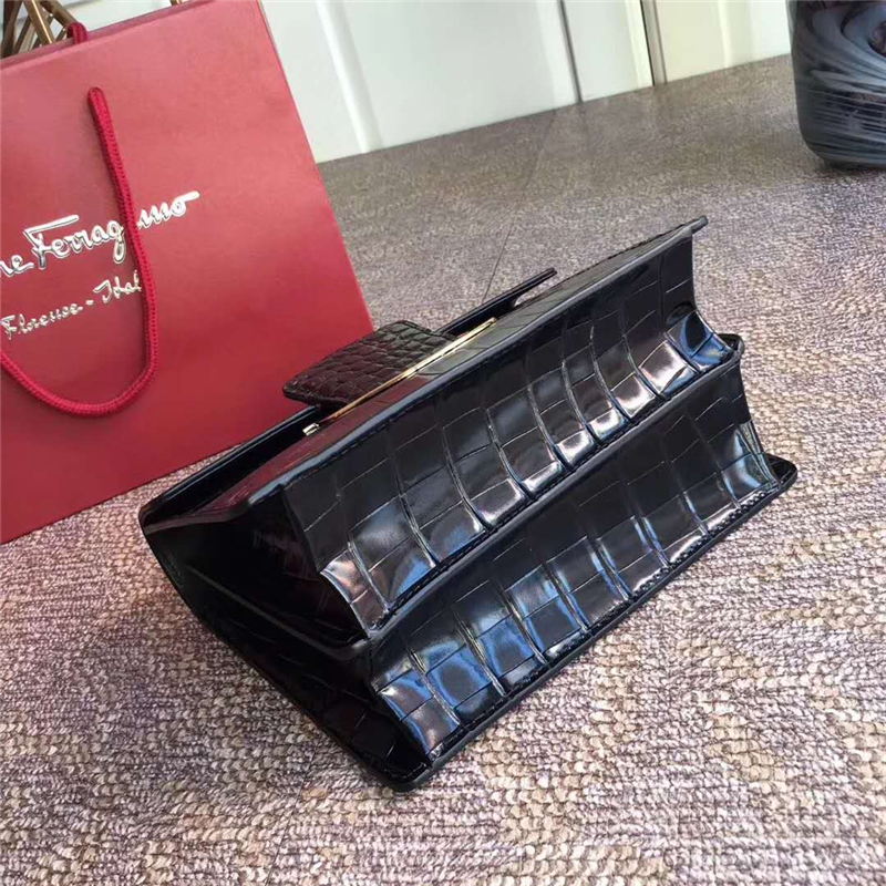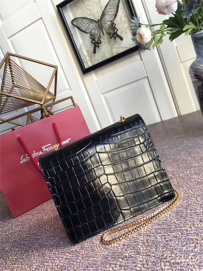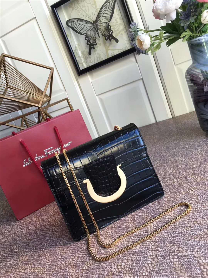 21F893 Ferragamo 菲拉格慕 半環(huán)搭扣 鱷魚紋 中號(hào)翻蓋 鏈條包 黑色