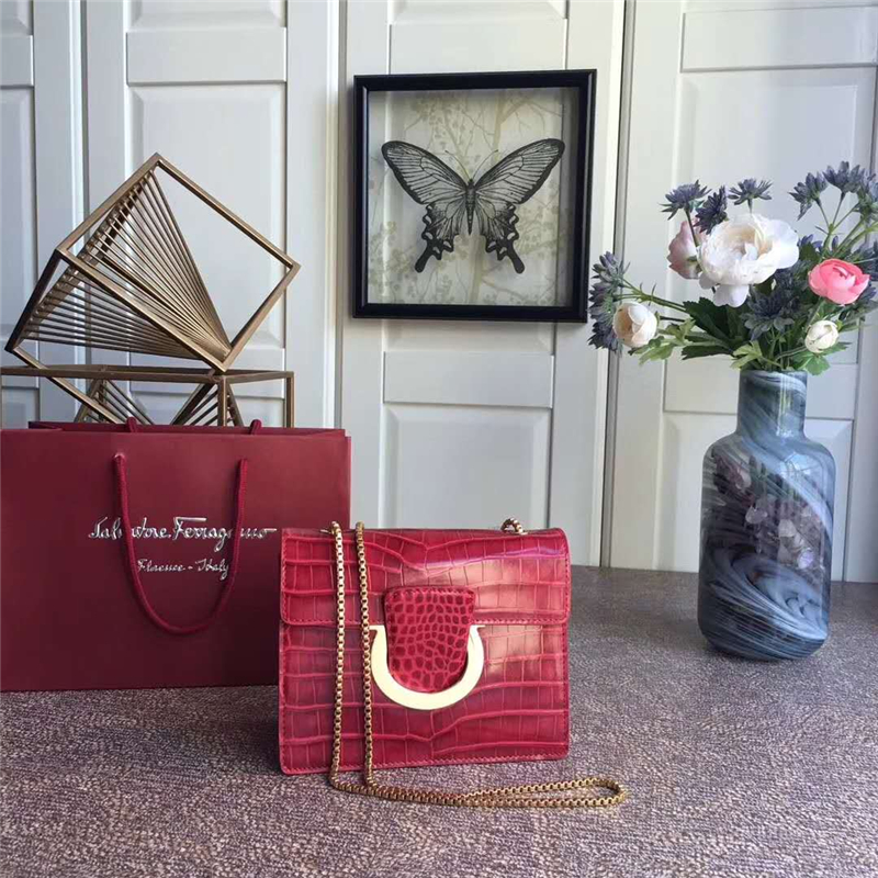21F893 Ferragamo 菲拉格慕 半環搭扣 鱷魚紋 中號翻蓋 鏈條包 紅色