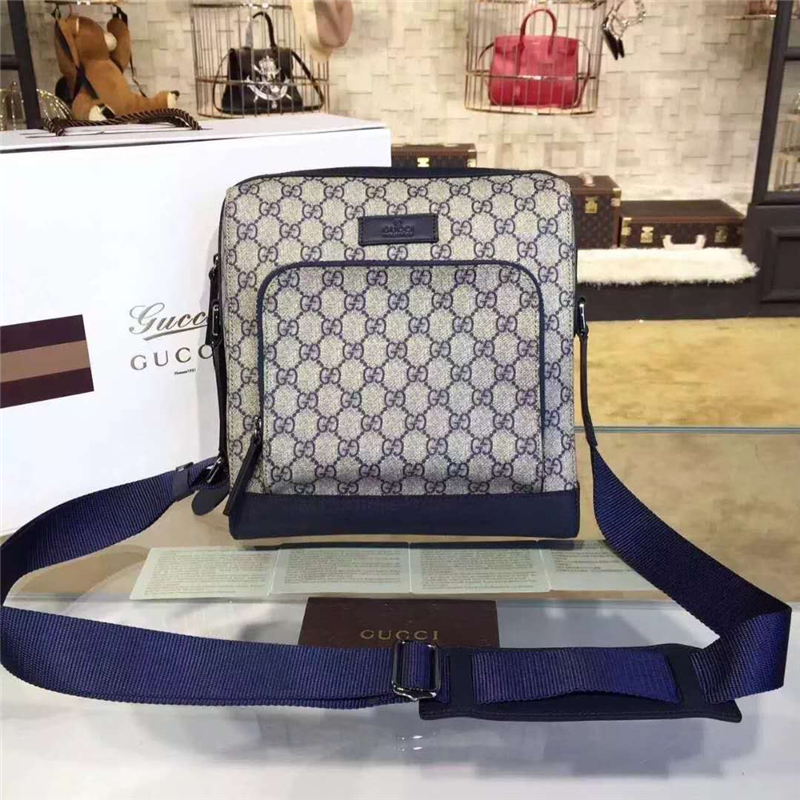 • 429018 GUCCI 經(jīng)典GG印花 防水材質(zhì) 單肩斜挎男包 灰白色藍(lán)帶