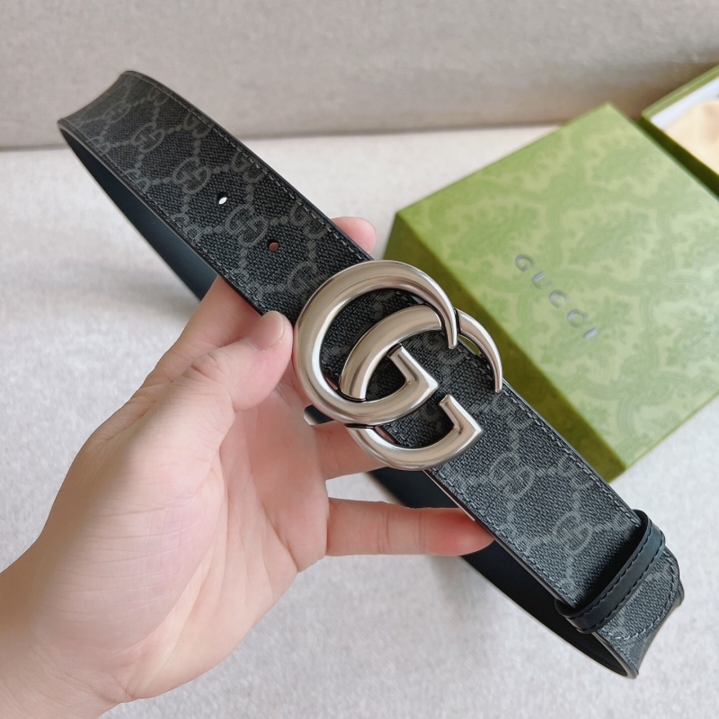 • 627055 Gucci雙G帶扣雙面腰帶 黑色GG Supreme帆布男士皮帶 銀扣