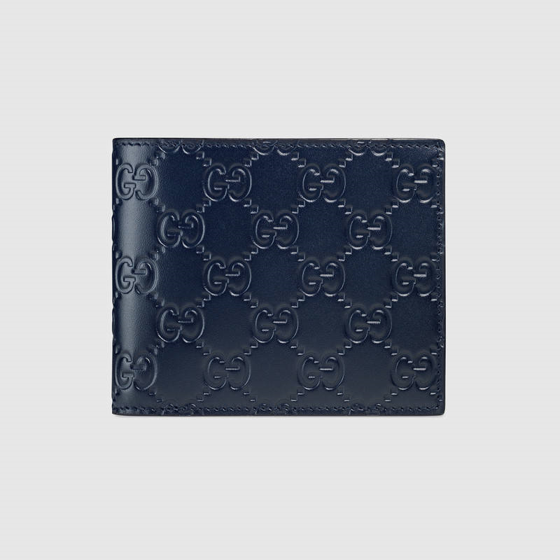 • 詳細介紹:雙折皮夾采用熱壓嵌印Gucci Signature皮革精制而成,印花紋理堅實。藍色Gucci Signature真皮,配以藍色真皮細節,兩個鈔票隔層,兩個平口袋