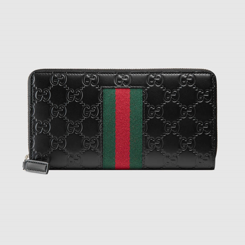 • 408831 Gucci Signature皮革條紋織帶全拉鏈式錢包 古馳錢包 黑色