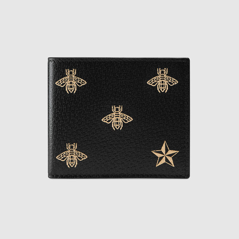 • 詳細介紹:Gucci蜜蜂——源自70年代典藏設計的歷史性標志——搭配精美的星星圖案。印花以金屬質感金色精美印制在雙折錢包的黑色皮革上。