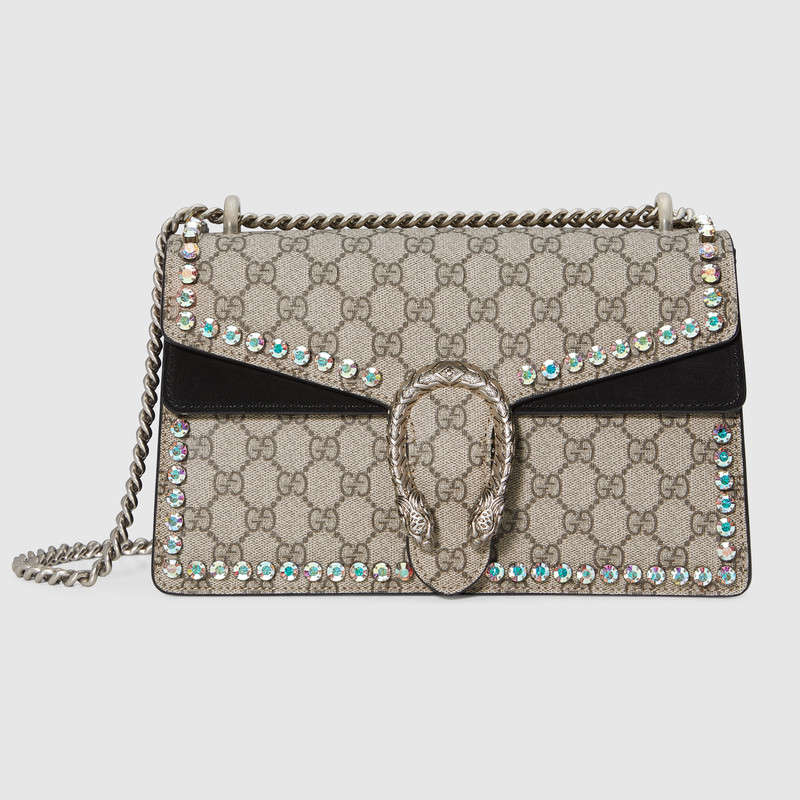 • 詳細介紹:Dionysus 系列肩背包,配以如今頗具代表性的織紋虎頭扣——此獨特細節靈感來源于希臘神祇狄俄尼索斯(Dionysus 系列),在神話中,他曾騎在宙斯(Zeus)派來的老虎身上,越過底格里斯河(Tigris);瑒渔湕l包有多種背法,可在肩背和手提之間自由轉換。造型邊緣裝飾大號水晶,外形獨特醒目。