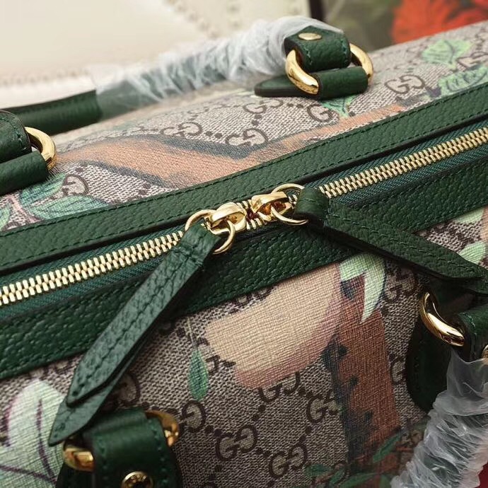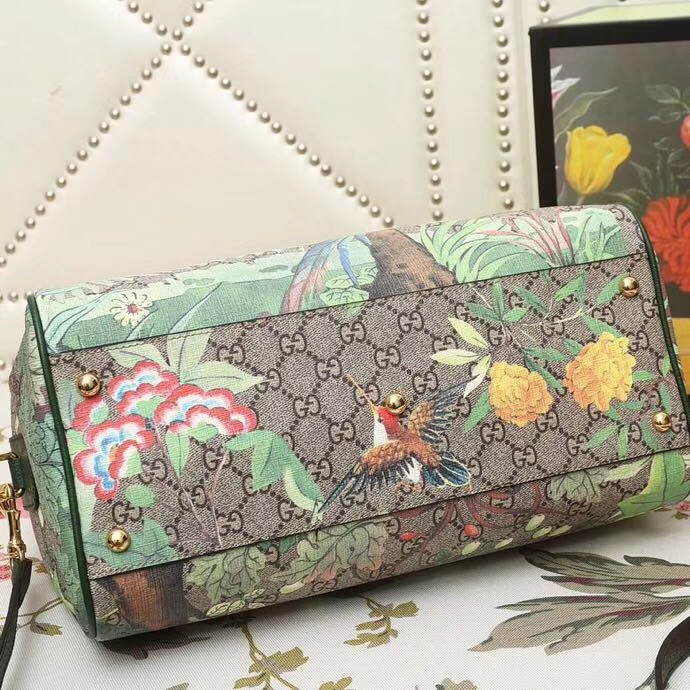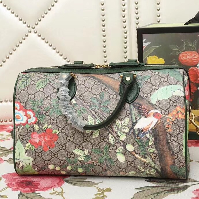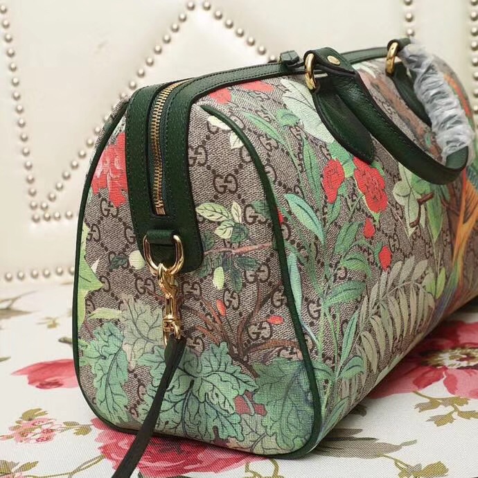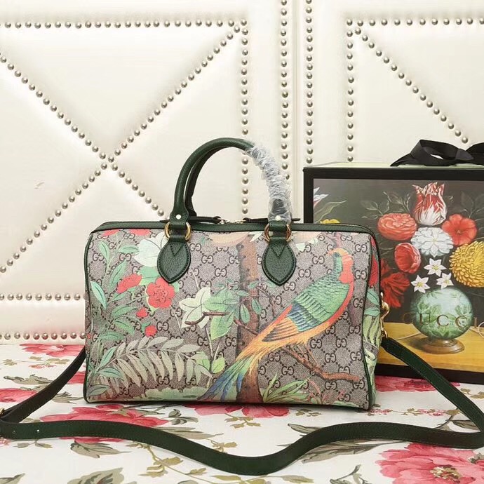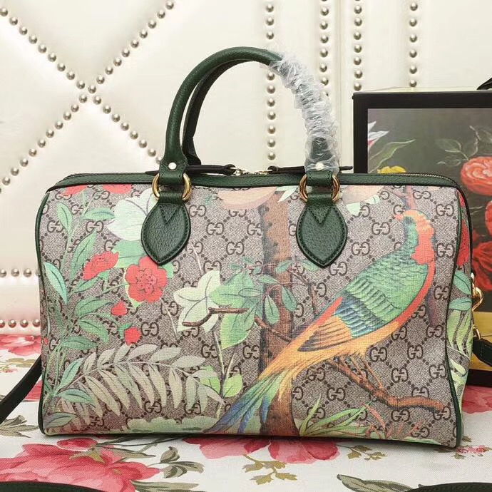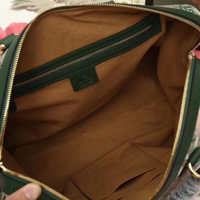- 409527 GUCCI GG Blooms花鳥印花 帆布拼皮 波士頓手提包 墨綠色