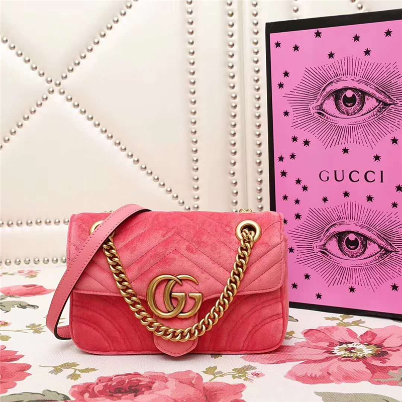 • 446744 GUCCI GG Marmont系列 波浪紋天鵝絨刺繡 鏈帶肩背包 西瓜紅