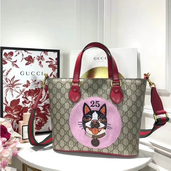• 473887 Gucci 梗犬波士頓Bosco圖案 高級(jí)人造帆布 手提袋 紅色