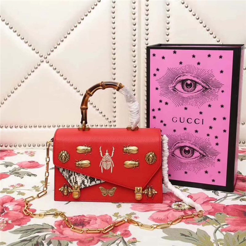 488715 Gucci ottilia 2017秋冬系列 撞色蛇皮 昆蟲印花 手提袋 紅色