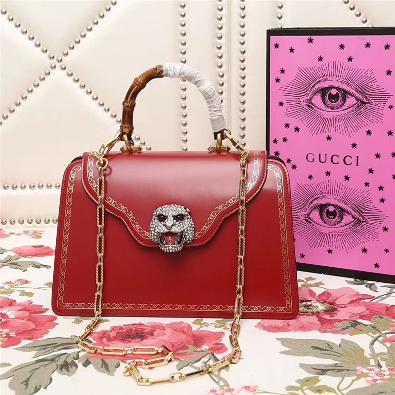 • 495881 Gucci女包 古馳手提包 虎頭鑲鉆 竹節提手 Gucci翻蓋鏈條包 紅色