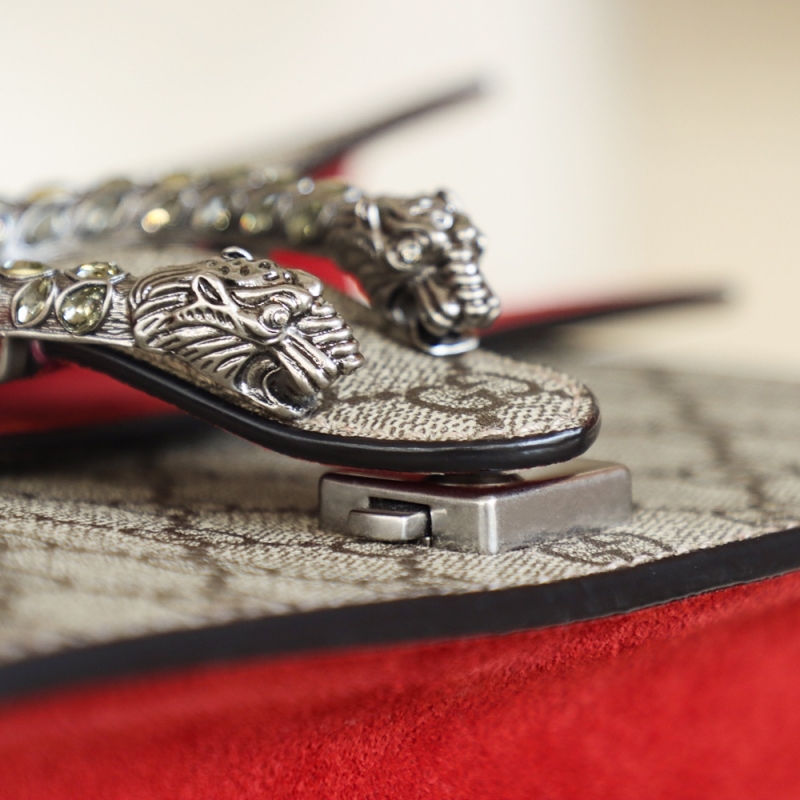 - 結(jié)構(gòu):米色/烏木色GG Supreme帆布,環(huán)保材料 紅色絨面材質(zhì) 飾水晶虎頭鎖扣 絨面材質(zhì)和GG帆布襯里 針扣,側(cè)開口 翻蓋口袋 滑動鏈條可調(diào)整為高58厘米的肩帶,或高32厘米的頂部提手