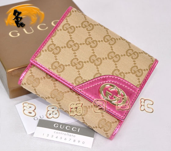 - 181594 古奇經(jīng)典雙G帆布女士錢夾 Gucci短款錢包 女包 一比一品質(zhì) 杏配桃紅色