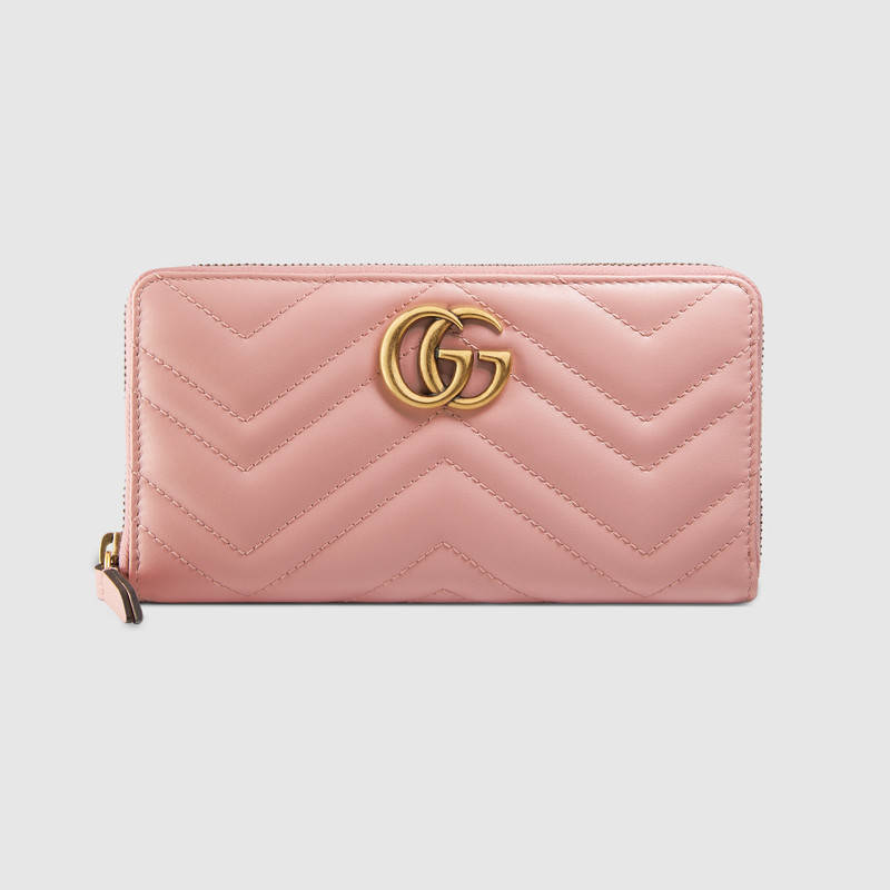 • 443123 GUCCI GG Marmont系列 絎縫皮革 雙G 全拉鏈式皮夾 淺粉色