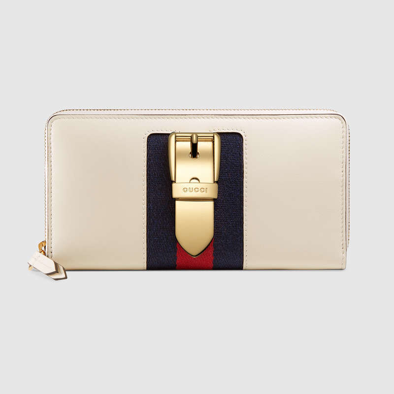 476083 GUCCI Sylvie 系列 皮革 藍紅尼龍織帶拼皮 全拉鏈式皮夾 白色