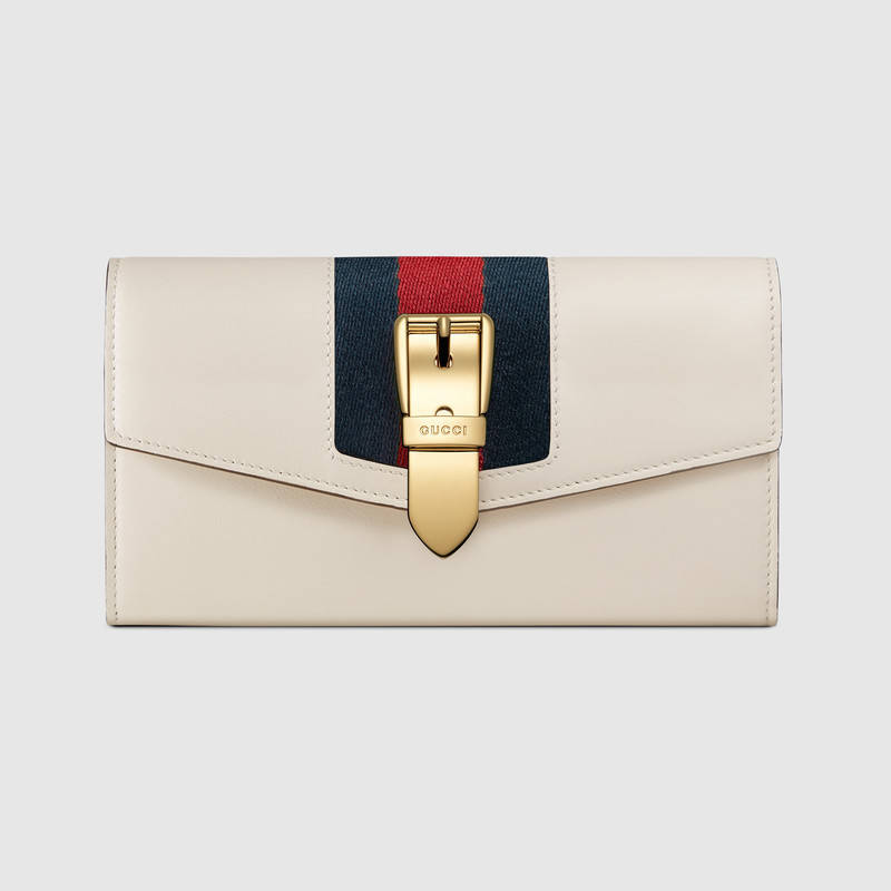 476084 GUCCI Sylvie 系列 皮革 藍紅尼龍織帶拼皮 長款皮夾 白色