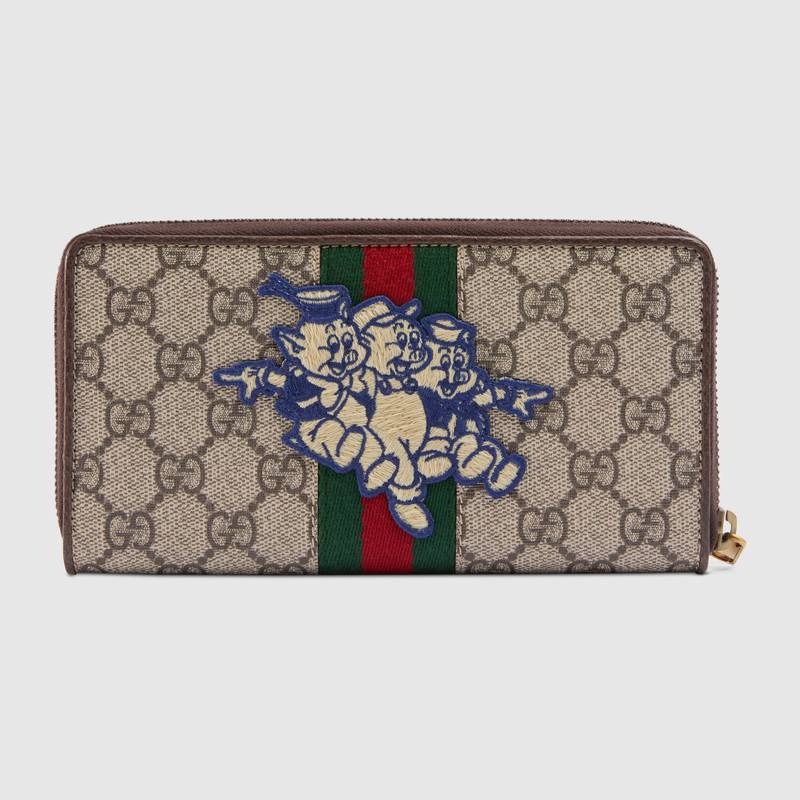 • 557696 GUCCI GG Supreme高級人造帆布 三只小豬圖案 全拉鏈錢包 烏木色