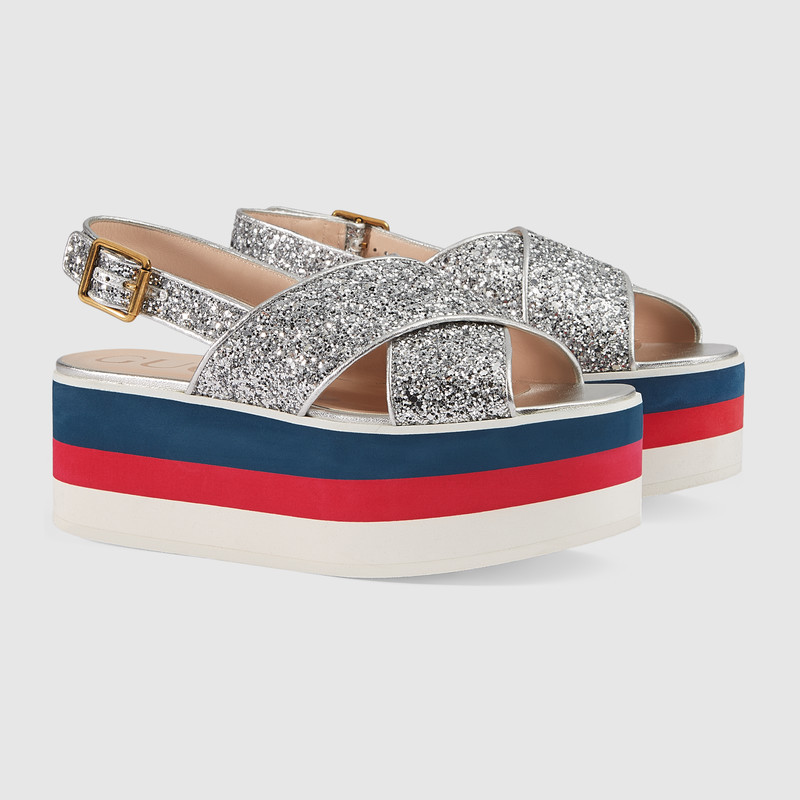 474534 GUCCI 閃光面料交叉帶 防水臺涼鞋 閃光銀色