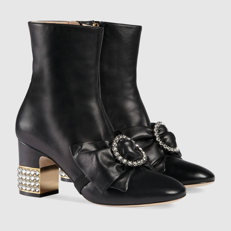 • 481171 GUCCI 可拆卸 珠寶蝴蝶結 皮革 及踝靴 高跟鞋 黑色