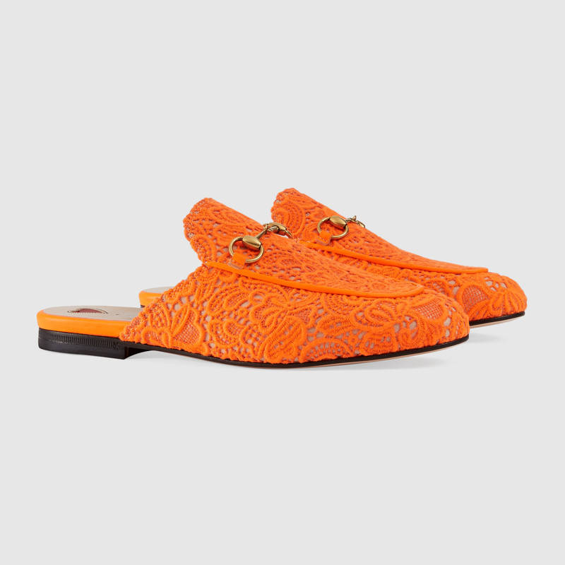 493958 GUCCI Princetown系列 馬銜扣 蕾絲拖鞋 熒光橙