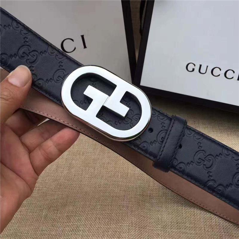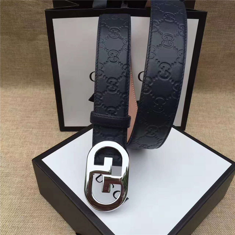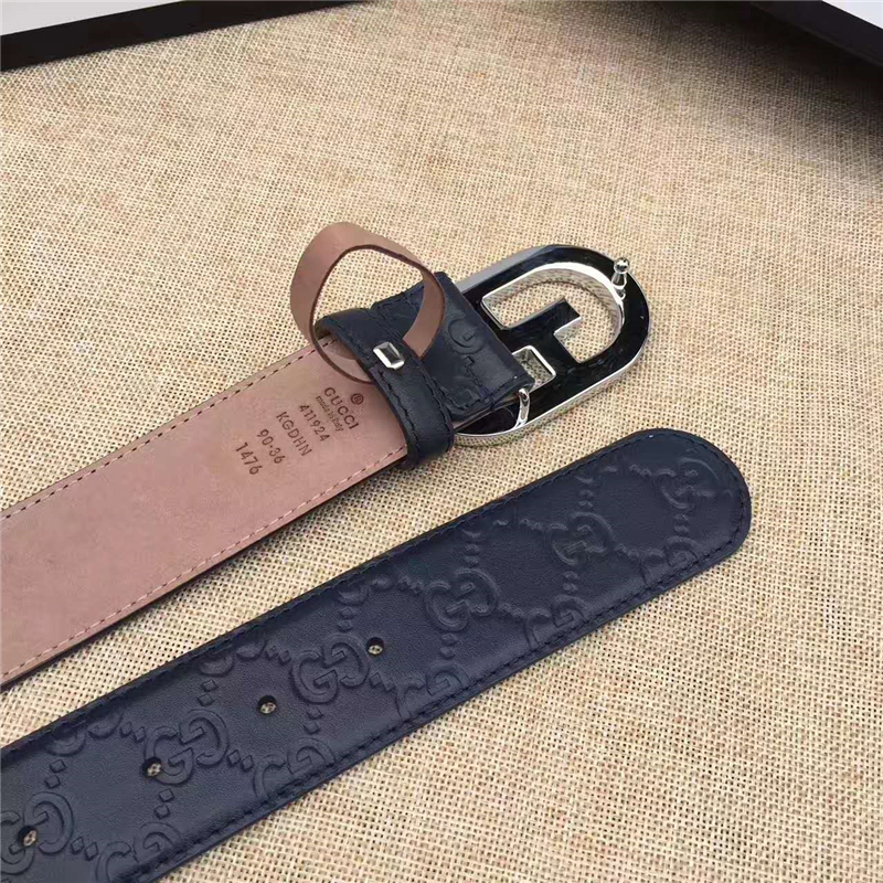 - Gucci 新款 原版牛皮 山茶花中間鑲珍珠雙G 女士腰帶 藏藍色