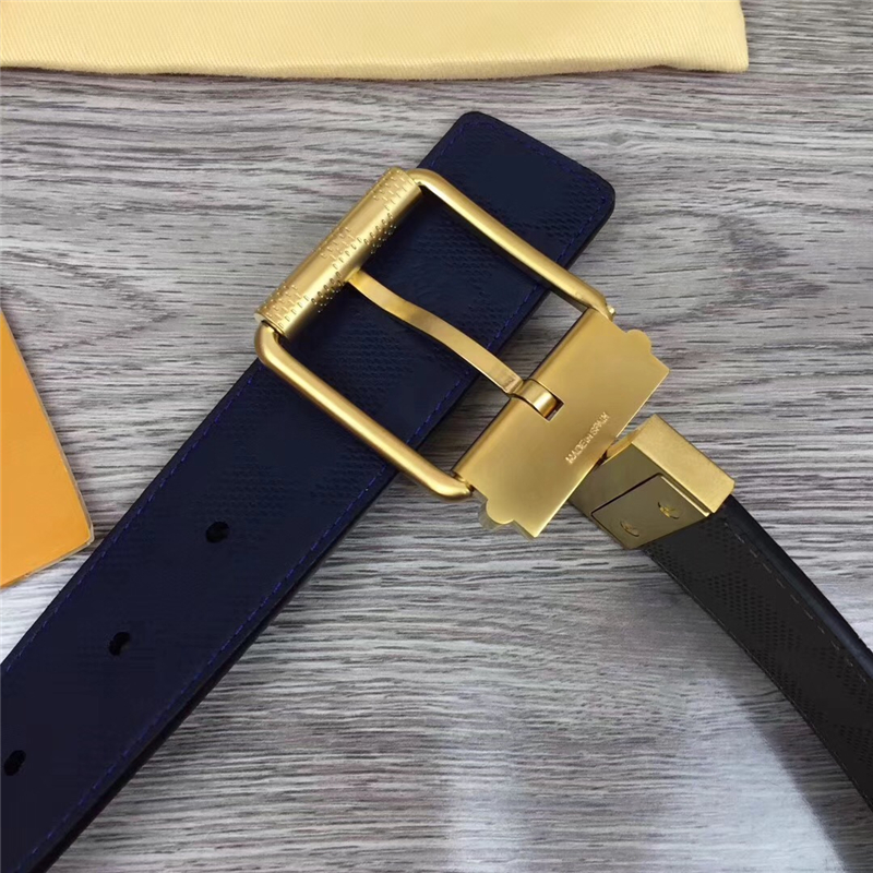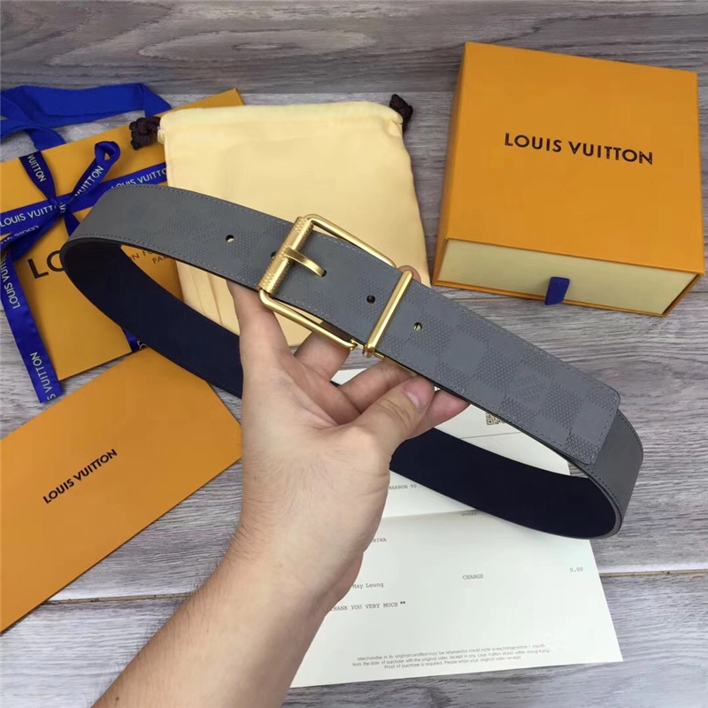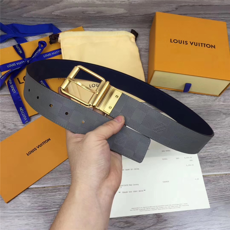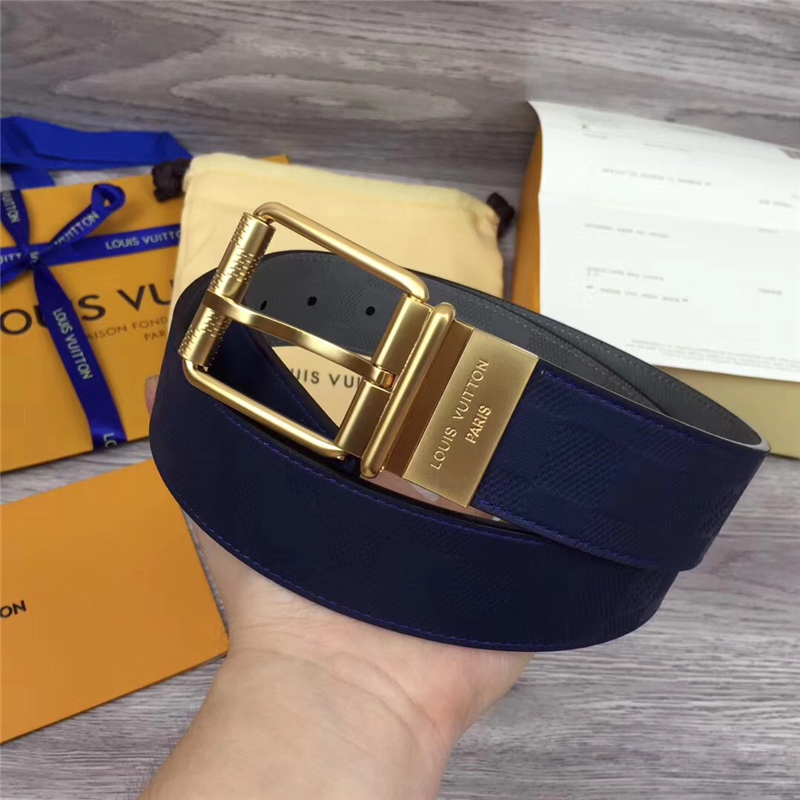 M9390 LV路易威登 進口小牛皮 雙面雙色格子紋 男士針扣皮帶 藍灰金扣