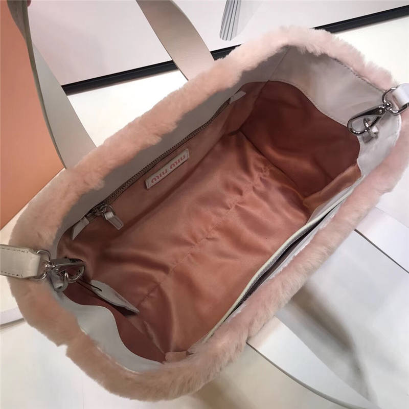 5BA085 MiuMiu女包 繆繆手提包 羊皮革提手 羊羔直毛手袋 粉色