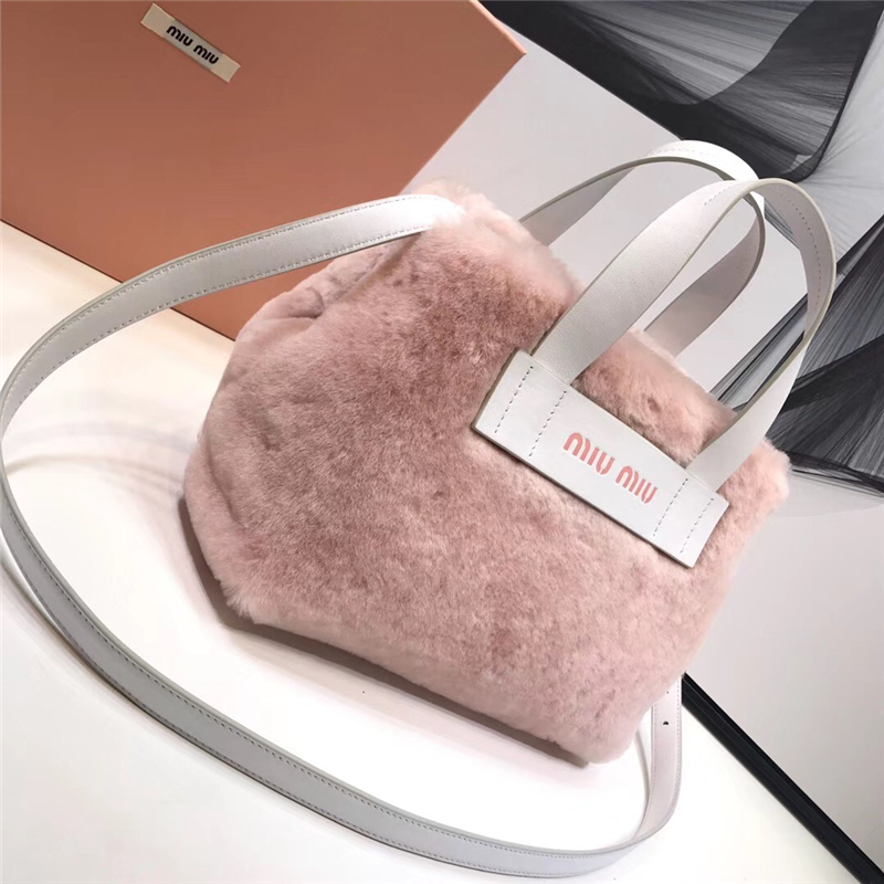 • 5BA085 MiuMiu女包 繆繆手提包 羊皮革提手 羊羔直毛手袋 粉色