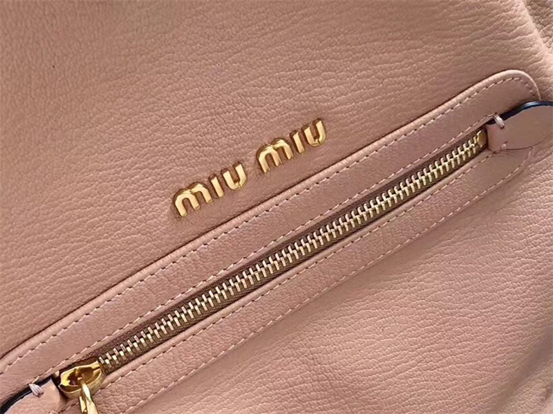 5BE027 MIUMIU繆繆 新款 山羊皮 編織皮革肩帶 抽繩水桶包 藕色