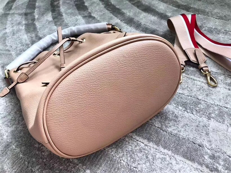 • 5BE027 MIUMIU繆繆 新款 山羊皮 編織皮革肩帶 抽繩水桶包 藕色