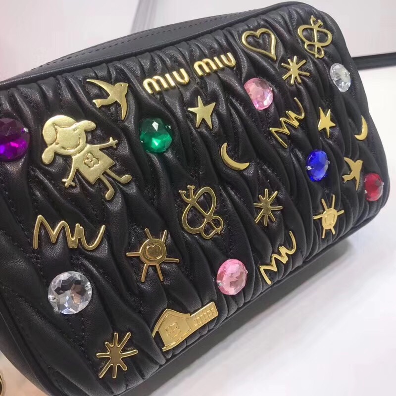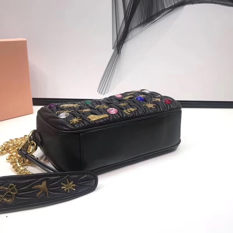 • 5BH118 MIUMIU專柜新款 褶皺小羊皮 貼花貼飾 相機包 黑色