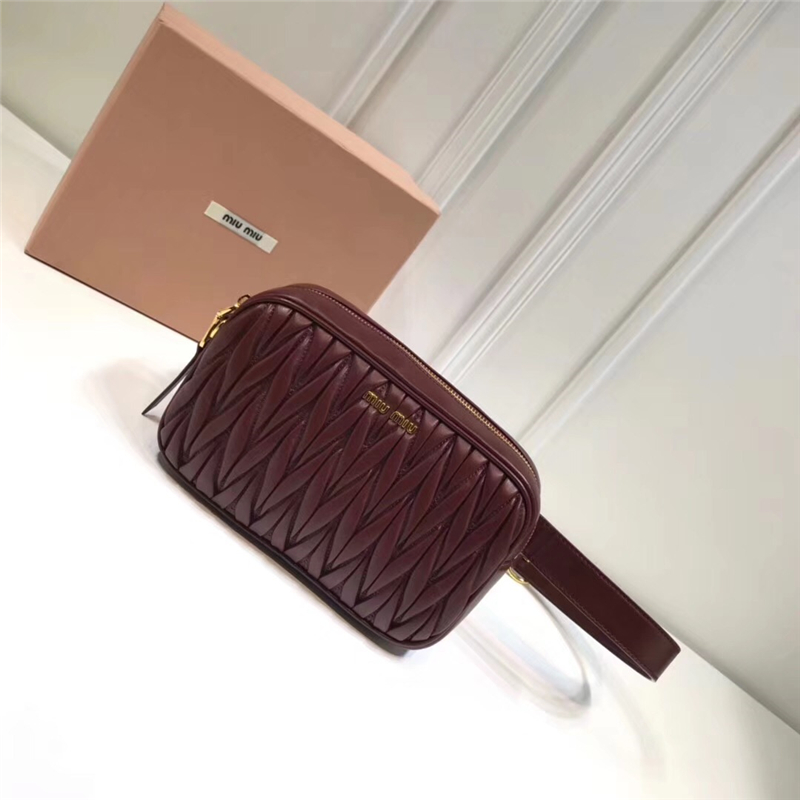 • 5BL018 MIUMIU繆繆 軟羊皮 經典褶皺 拉鏈 皮腰包 棗紅色