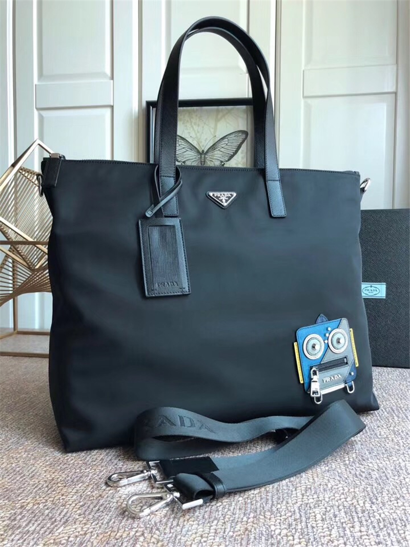 2VG024 Prada普拉達男包 皮革雙手柄 彩色機器人圖案 尼龍手提包 黑色