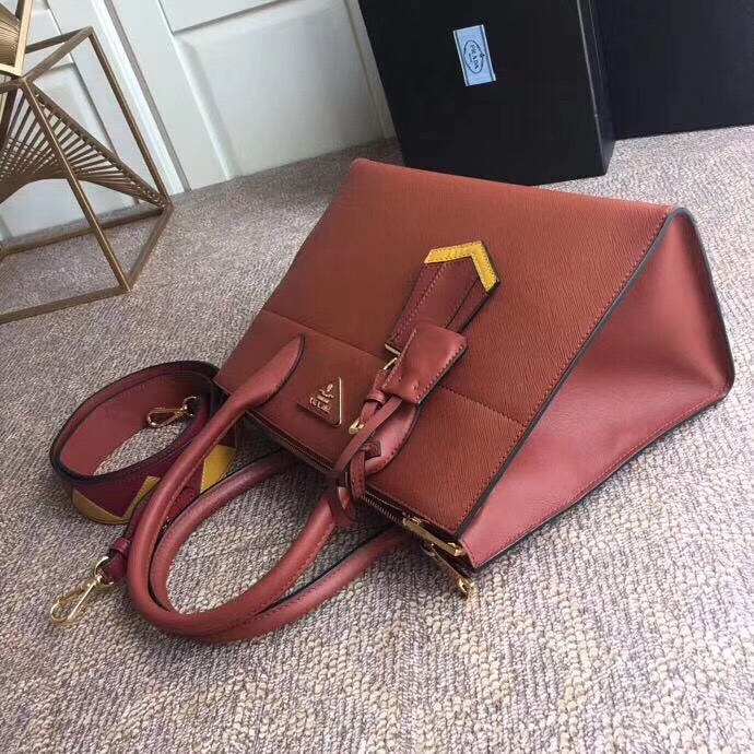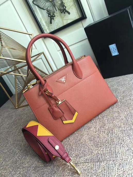 1BA102 Prada普拉達(dá) 最新款 拼色牛皮 女士手提袋 磚紅