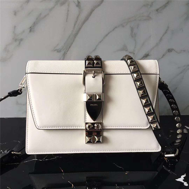 1BD120 Prada普拉達(dá) 2018早春最新款 鉚釘裝飾 小牛皮手袋 白色