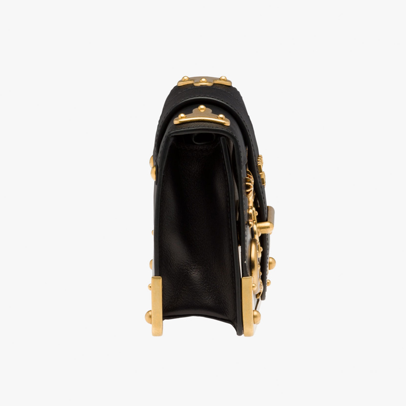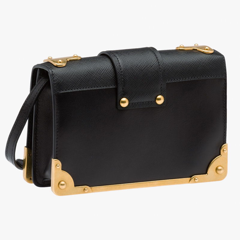 - 結(jié)構(gòu):金屬裝飾Prada Cahier小牛皮手袋可拆卸式皮革肩帶青銅五金配件青銅字母標(biāo)識(shí)帶按扣的翻蓋開合一個(gè)內(nèi)袋軟羊革襯里