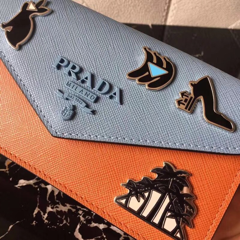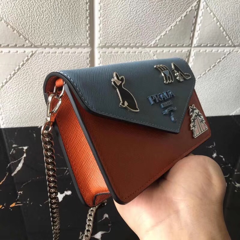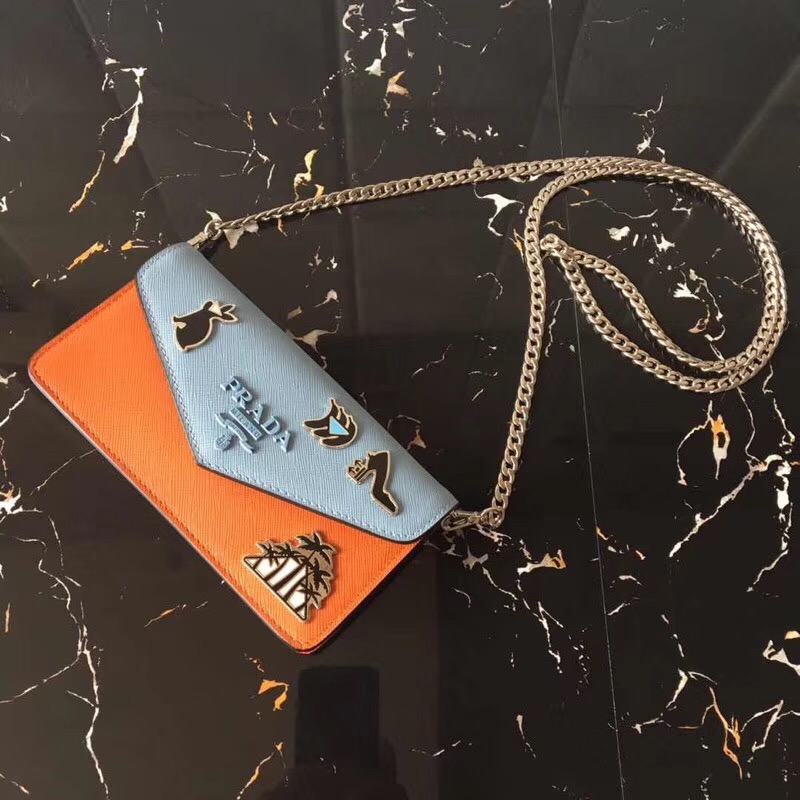 1DH044 Prada新款 Saffiano皮革 普拉達斜挎包 拼色鏈條包 海藍配木瓜色