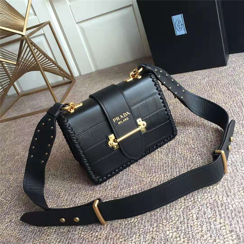 當前位置: 首頁>Prada|普拉達>Prada女包> Prada cahier女袋 鱷魚紋牛皮 編織設計包邊 普拉達單肩斜挎包 黑色