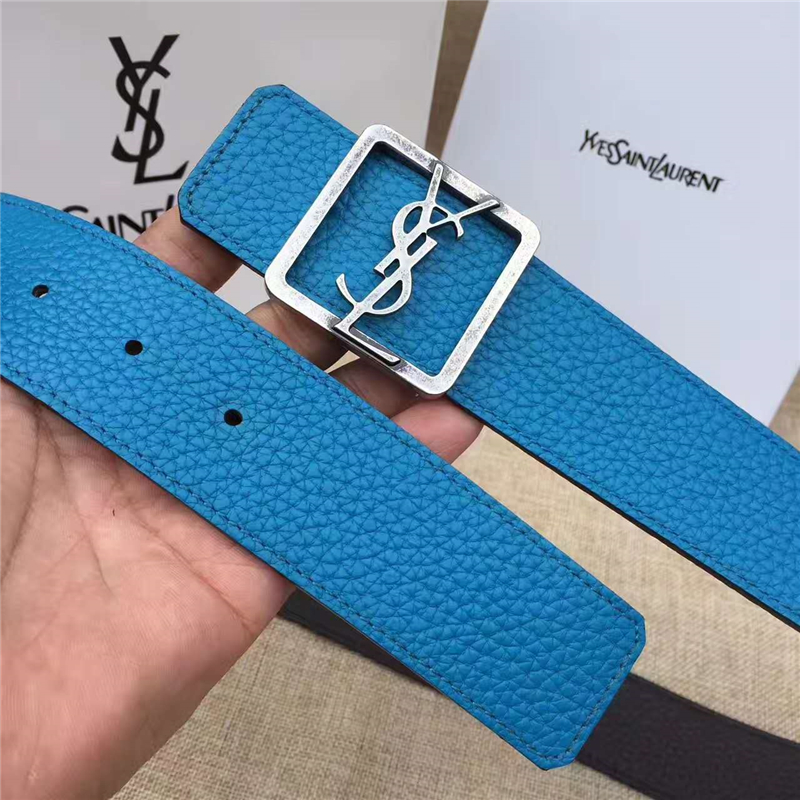 • 圣羅蘭YSL女士腰帶 頭層牛皮荔枝紋 實心復古銅扣頭 雙面可用 藍色