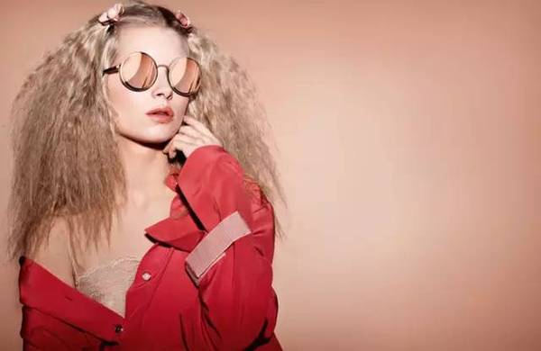 Lottie Moss還以一襲黑色蕾絲輕衣,搭配鏡片鑲飾18K黃金的蝴蝶框太陽眼鏡;又或者不經意地松開紐扣半露香肩的紅色襯衫,搭配18K玫瑰金鏡片的圓框款式,甜美純真的同時透出濃濃的六十年代嬉皮士風情。