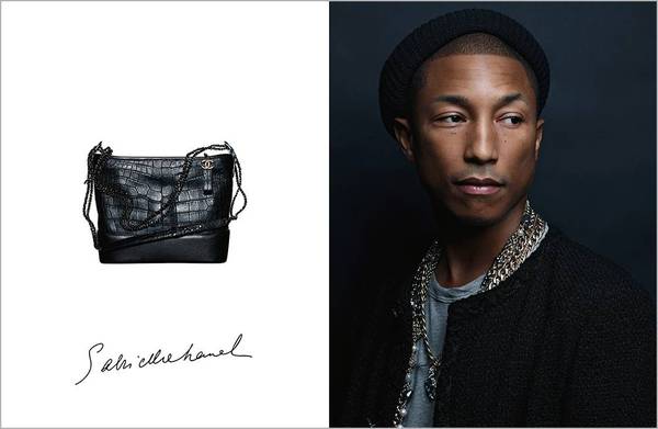 香奈兒Gabrielle手袋平面廣告大片,由卡爾·拉格斐掌鏡拍攝。鏡頭中,Pharrell Williams斜挎黑色短吻鱷魚皮香奈兒Gabrielle手袋。