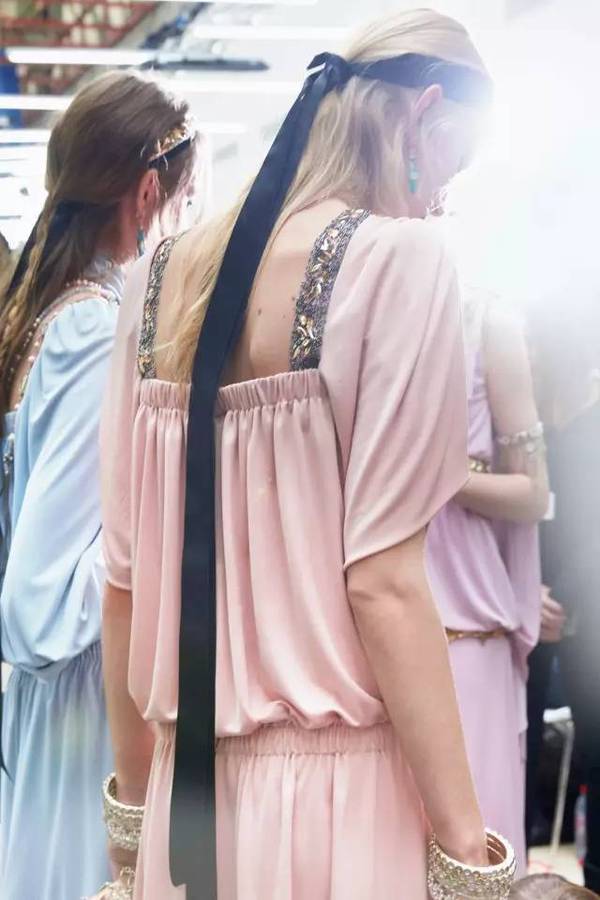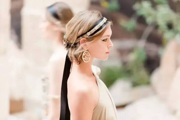 繡以珠子與金色花卉圖案的絲質緞帶,仿若奧林匹克月桂花冠般飾于發間,在強調面部線條的同時,賦予整體廓形流動感。
