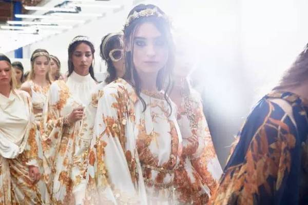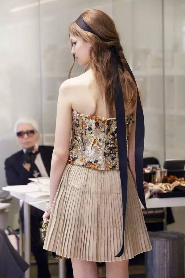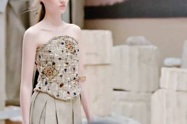 亞麻帆布制作的簡約百褶裙,從斯巴達風格服飾中汲取靈感,配以繡有彩色晶石的緊身胸衣。