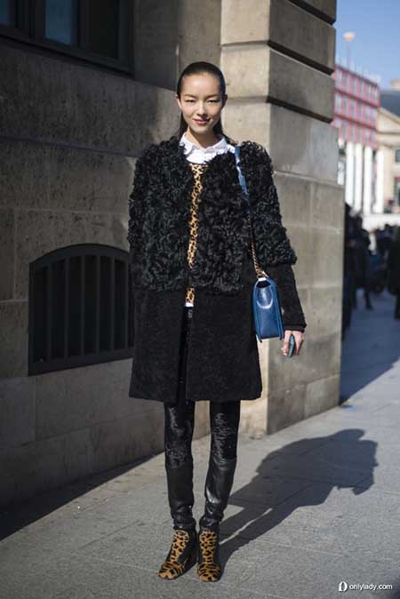 中國超模孫菲菲以黑色皮毛拼接款大衣搭配復(fù)古款的絲絨褲。再以野性的豹紋衫作為內(nèi)搭,若隱若現(xiàn)間散發(fā)魅力無限。同時,豹紋靴更是加強了整體裝扮的完整度。再以搶眼的藍色Boy Chanel點亮整體色系,時尚之余,盡展超模氣勢。